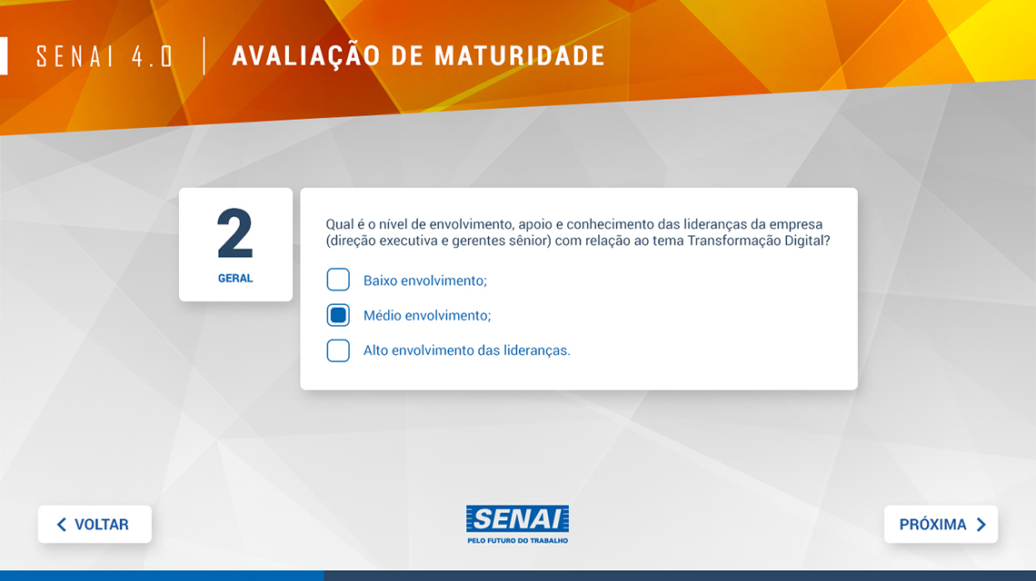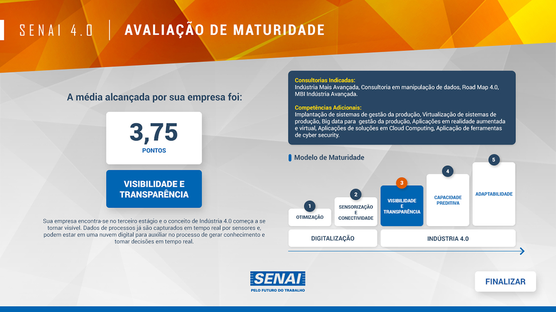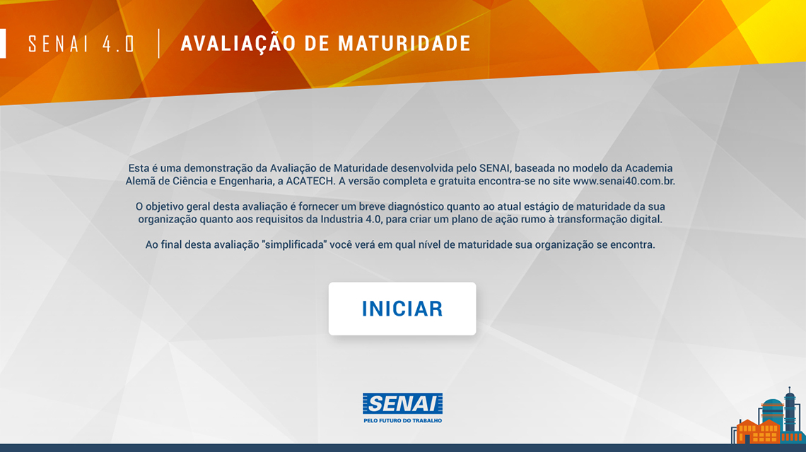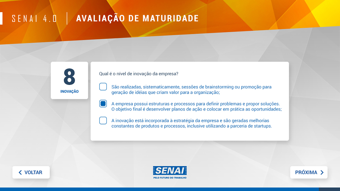 O aplicativo Avaliação de Maturidade realizou uma pesquisa com empresários sobre o nível de digitalização e inovação dentro de suas empresas. Com acesso via QR Code impresso na credencial do evento, o aplicativo também enviava o resultado obtido para o e-mail do usuário.