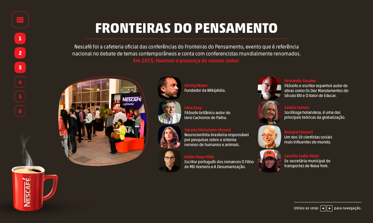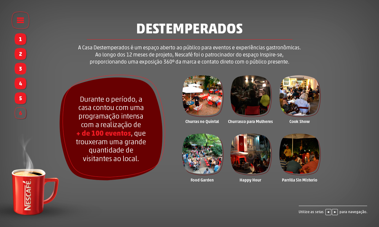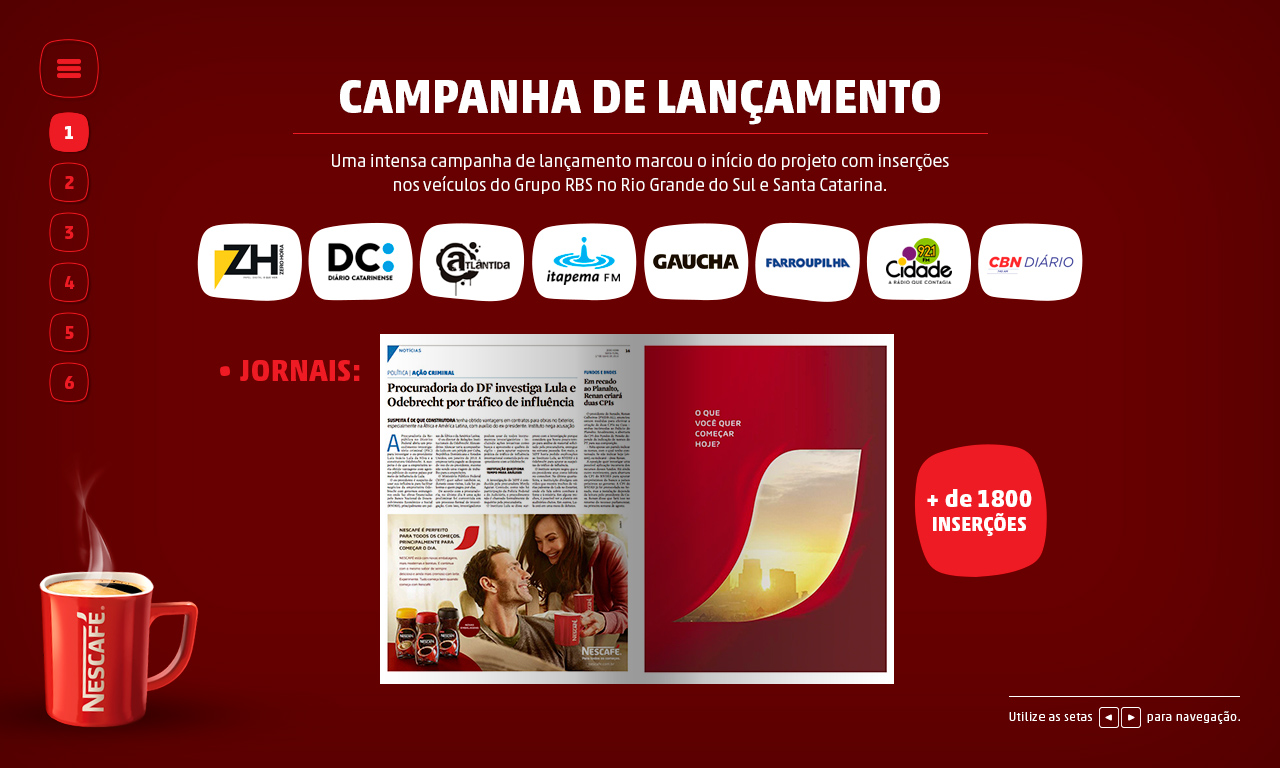 O Grupo RBS desenvolveu durante 12 meses um projeto de ações e mídia para Nescafé ampliar sua atuação no mercado do sul do país. Uma série de eventos foram realizados, assim como anúncios nos veículos do grupo. Para finalizar e apresentar os resultados da parceria, desenvolvemos um projeto de pós-venda que contou com uma apresentação interativa, um videocase e um kit de entrega.